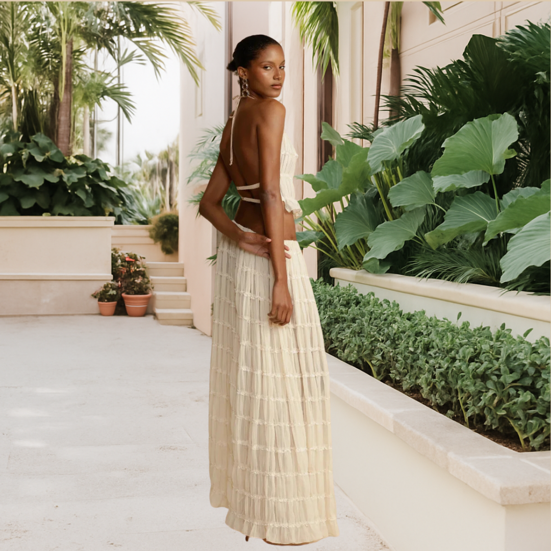 A light skirt, a structured top, a look that dances with you.